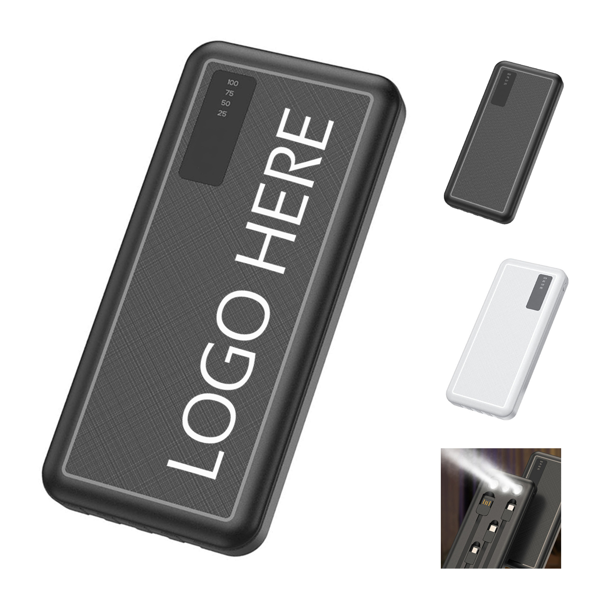 Multifunctional portable power bank, with simple business style, 4 bulit-in USB cable and LED flashlight function.