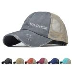 This baseball cap has a vintage and distressed appearance, with a six-panel construction, sewn eyelets for ventilation and an internal sweatband for added comfort. The design features a pre-curved visor and an adjustable rear hook and loop closure.