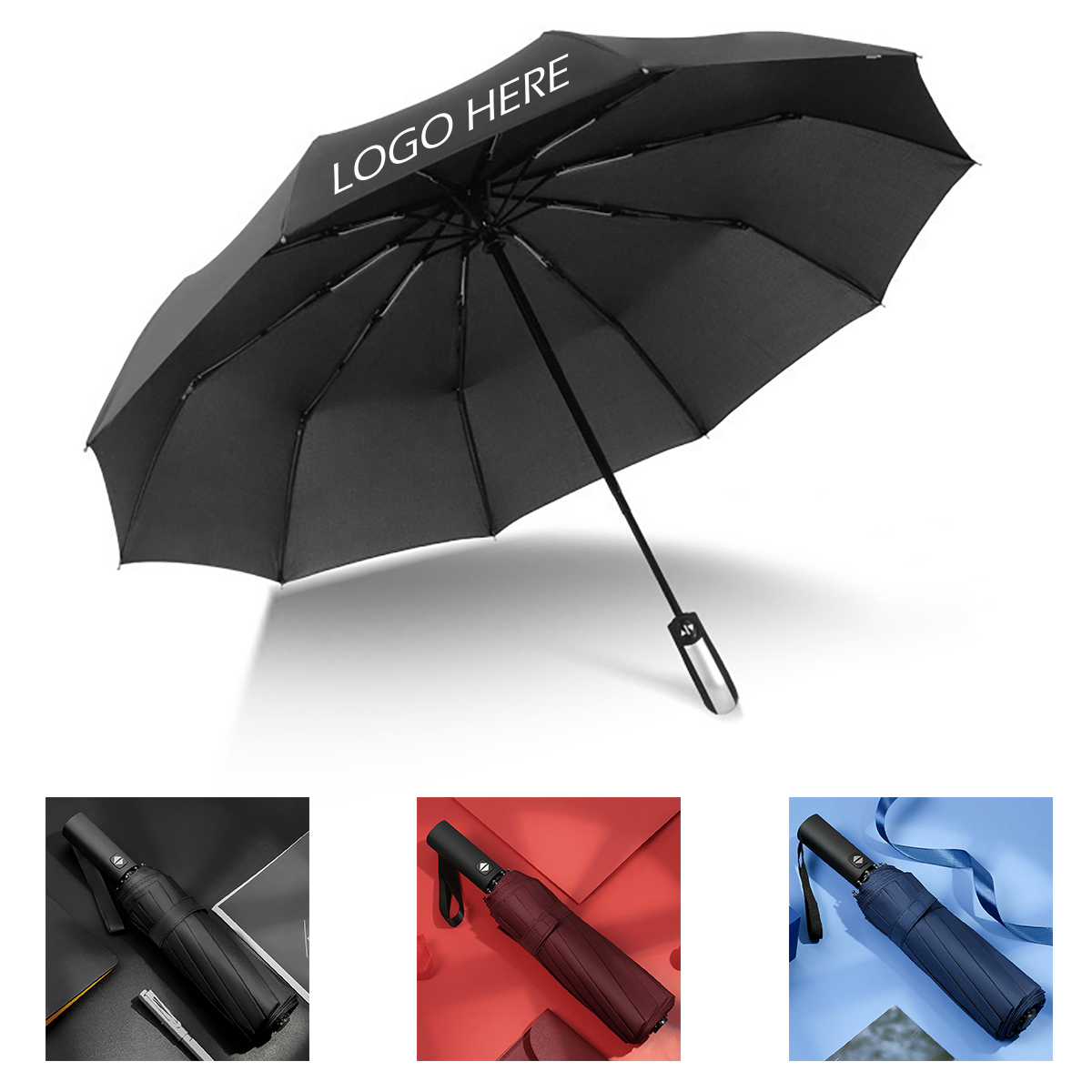 This retractable folding umbrella comes with an extra umbrella cover. Our folding automatic umbrellas feature fiberglass and metal frames. It has a slim black rubber handle with built-in buttons for automatic opening.